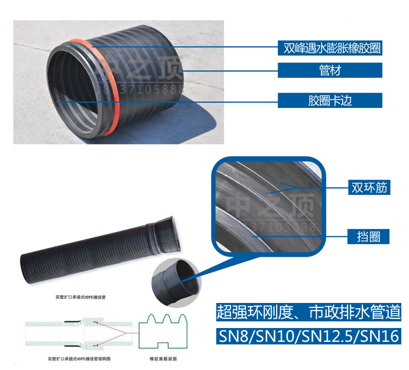 連接止水雙重保障:一重(chóng)保障:橡膠圈遇水膨(péng)脹,雙(shuāng)峰止水;二重保障:管(guǎn)件內襯360°雙環筋與膠(jiāo)圈緊密銜(xián)接(jiē),為止水提供了第二重保障,同時雙環筋(jīn)有效提升(shēng)了管件的強度。